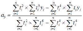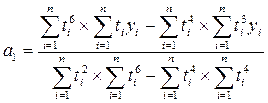 y1988 =2.97+(-0.17)x(-7)+0.02x49=5 y1989 =2.97+(-0.17)x(-5)+ 0.02x25=4.25 y1990 =2.97+(-0.17)x(-3)+ 0.02x9=3.64 y1991 =2.97+(-0.17)x(-1)+ 0.02x1=3.16 y1992 =2.97+(-0.17)x1+0.02x1=2.82 y1993 =2.97+(-0.17)x3+0.02x9=2.62 y1994 =2.97+(-0.17)x5+0.02x25=2.55 y1995 =2.97+(-0.17)x7+0.02x49=2.62 г) для параболы третьего порядка yi = a0 + a1 t+a2 t2 +a3 t3 (при ∑ti =0)