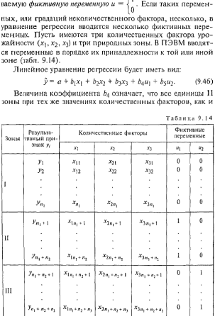 Результат неблагоприятен: доход снижается. Долгосрочный прогноз А — «осторожный», он предполагает весьма умеренный прогресс факторов и соответственно небольшое увеличение дохода. Вариант Б — «оптимистический», рассчитан на существенное изменение факторов. Вариант 5 построен по способу, которым Агафья Тихоновна в комедии Н. В. Гоголя «Женитьба» мысленно конструирует портрет «идеального жениха»: нос взять от одного претендента, подбородок от другого, рост от третьего, характер от четвертого; вот если бы соединить все нравящиеся ей качества в одном человеке, она бы не колеблясь вышла замуж. Так и при прогнозировании мы объединяем лучшие (с точки зрения модели дохода) наблюдаемые значения факторов: берем значение Х[ от хозяйства № 10, значение х2 от хозяйства № 2, значение х3 от хозяйства № 16. Все эти значения факторов уже существуют реально в изучаемой совокупности, они не «ожидаемые», не «взятые с потолка». Это хорошо. Однако могут ли эти значения факторов сочетаться в одном предприятии, системны ли эти значения? Решение данного вопроса выходит за рамки статистики, оно требует конкретных знаний об объекте прогнозирования. Если, кроме количественных факторов, при многофакторном регрессионном анализе в уравнение включается и неколичественный, то применяют следующую методику: наличие неколичественного фактора у единиц совокупности обозначают единицей, его отсутствие — нулем, т.е. вводят так назы-