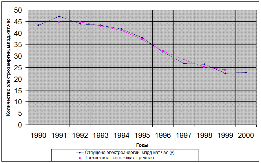 Выявить основную тенденцию отпуска электроэнергии за пределы РФ за 1990-2000 гг.: 1) методом трехлетней скользящей средней; 2) методом аналитического выравнивания; 3) изобразить графически фактические и выравненные значения. Алгоритм решения задачи: 1) Метод трехлетней скользящей средней Исчисляем средний уровень из 11 первых по счету уровней ряда. Для этого используем формулу средней арифметической: Y ср = y1 + y2 +… + yn / n где y1 ;y2 ; yn – индивидуальные значения варьирующего признака; n – число единиц совокупности. В нашем примере трехлетняя скользящая средняя, поэтому n = 3. Y2 ср = y1 + y2 + y3 / 3 = 43,4 + 47,2 + 44,0 / 3 = 44,87 Y3 ср = y2 + y3 + y4 / 3 = 47,2 +44,0 + 43,4 / 3 = 44,87 Y4 ср = y3 + y4 + y5 / 3 = 44,0 + 43,4 + 41,7 / 3 = 43,03 Y5 ср = y4 + y5 + y6 / 3 =43,4 + 41,7 + 38,0 / 3 = 41,03 Y6 ср = y5 + y6 + y7 / 3 = 41,7 + 38,0 + 31,8 / 3 = 37,17 Y7 ср = y6 + y7 + y8 / 3 = 38,0 + 31,8 + 26,8 / 3 = 32,2 Y8 ср = y7 + y8 + y9 / 3 = 31,8 + 26,8 + 26,4 / 3 = 28,33 Y9 ср = y8 + y9 + y10 / 3 = 26,8 + 26,4 + 22,5 / 3 = 25,23 Y10 ср = y9 + y10 + y11 / 3 = 26,4 + 22,5 + 22,9 / 3 = 23,93 В результате обработки ряда мы видим, что появилась тенденция к существенному уменьшению потребления электроэнергии (в 1990 году расход составил 43,4 млрд.квт.час, в 2000 году – 22,9). Графически эта тенденция выглядит так:
