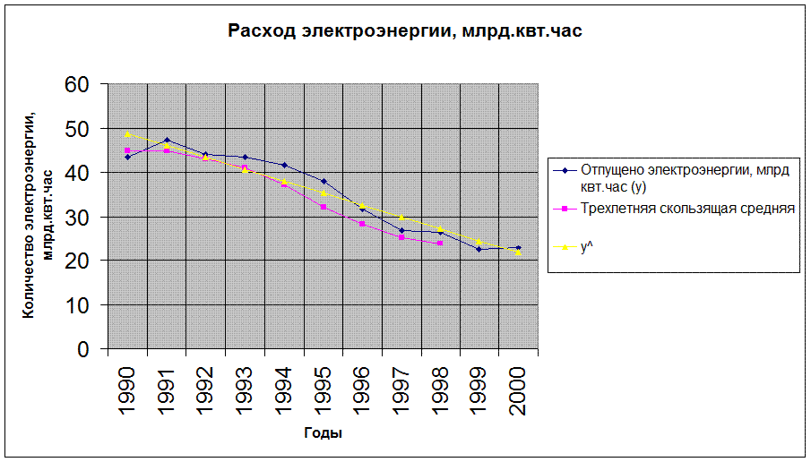 Из первого уравнения а0 = ∑ y / n а0 = 388,1 / 11 = 35,28 Из второго уравнения а1 = ∑ yt / ∑ t 2 а1 = -297,2 / 110 = -2,7 Уравнение прямой, представляющее собой трендовую модель искомой функции, имеет вид: : yt ^ = 35,28 – 2,7 t . Подставляя в данное уравнение последовательно значения t , равные -9, -7, -5, -3, -1, +1, +3, +5, +7, +9, находим выравненные уровни yt . Y1 ^ = 35,28 – 2,7 * (-5) = 48,78 Y2 ^ = 35,28 – 2,7 * (-4) = 46,08 Y3 ^ = 35,28 – 2,7 * (-3) = 43,38 Y4 ^ = 35,28 – 2,7 * (-2) = 40,68 Y5 ^ = 35,28 – 2,7 * (-1) = 37,98 Y6 ^ = 35,28 – 2,7 * 0 = 35,28 Y7 ^ = 35,28 – 2,7 * 1 =32,58 Y8 ^ = 35,28 – 2,7 * 2 = 29,88 Y9 ^ = 35,28 – 2,7 * 3 = 27,18 Y10 ^ = 35,28 – 2,7 * 4 = 24,48 Y 11 ^ = 35,28 – 2,7 * 5 = 21,78 Если расчеты выполнены правильно, то ∑ y = ∑ yt ^ . В нашем примере ∑ y = ∑ yt ^ = 388,1. Следовательно, значения уровней ряда найдены верно. Полученное уравнение показывает, что несмотря на значительные колебания в отдельные годы, наблюдается тенденция снижения потребления электроэнергии: с 1990 года по 2000 год отпуск энергии в среднем снижался на а1 = -2,7 млрд.квт.час в год. 3) Фактические и расчетные значения отпущенной электроэнергии представим на одном графике:
