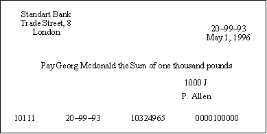 Чек — різновид переказного векселя, де платником є банк. Чеки використовують фізичні та юридичні особи для взаємних розрахунків. Власник рахунка отримує чекову книжку і виписує чеки в межах залишку коштів на рахунку (або більше цього залишку, якщо є домовленість про овердрафт). Необхідні реквізити чека: назва банку, безумовний наказ про оплату суми, одержувач коштів, дата і місце виписування чека, підпис чекодавця. Чек може мати довільну форму і бути виписаним на звичайному аркуші паперу. Але, як правило, застосовується стандартна форма чека (див. рис. 1). У верхньому правому куті чека зазначається кодовий номер банку, який використовується при сортуванні чеків. У нижньому рядку є цифри, надруковані магнітним чорнилом, що використовуються при комп’ютерній обробці чека: зліва направо — номер чека, кодовий номер банку, номер рахунка клієнта, сума чека. Аналогічно векселю, залежно від того, на чию користь виписано чек, розрізняють такі види чеків: іменні (рау tо thе пате оf Н) — заплатіть тільки N; ордерні (рау tо thе order оf N) — заплатіть N або за його наказом; на пред’явників (рау tо thе bearer) — заплатіть пред’явникові. Чеки можуть використовуватися за індосаментом (передавальний напис на зворотному боці чека). Цим самим власник чека передає право отримання грошей за чеком іншій особі.