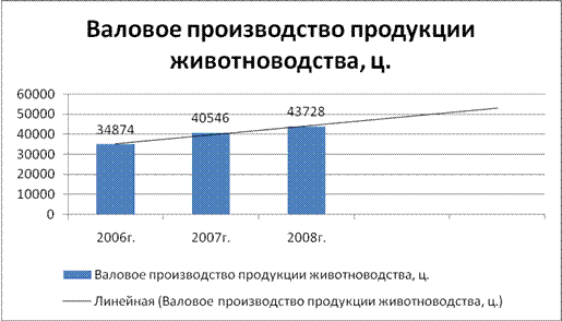 На основании табл. сделаем вывод о том, что общая земельная площадь предприятия за анализируемый период осталась неизменной. Среднегодовая численность работников снизилась на 8,9 %, в том числе работников занятых в сельскохозяйственном производстве на 9,1 %. Среднегодовая стоимость основных производственных фондов изменилась незначительно, произошло увеличение всего на 16251 тыс. руб. За последние 3 года валовое производство основных видов продукции в целом увеличилось на 69,1% или 24089ц. В том числе увеличилось производство молока на 27,6%, прироста живой массы КРС 9,6 % и зерна – 69,1%. Таким образом, увеличились практически все показатели размера предприятия, за исключением среднегодовой численности работников, что свидетельствует о положительной тенденции развития предприятия. Проанализируем динамику валового производства продукции животноводства. Составим прогноз на 2010 г.