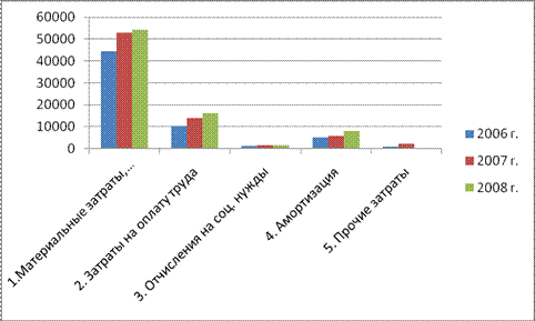 Как мы видим, отрасль сельского хозяйства является материалоемкой. Основную сумму затрат представляют собой такие элементы, как: корма, нефтепродукты, заработная плата и амортизация. Наименьший удельный вес в общей структуре затрат занимают: химические средства для защиты растений, затраты на улучшение земель, ремонт техники и зоотехническому и ветеринарному обслуживанию. Рассмотрим динамику затрат. В 2008 г. по сравнению 2006 г. произошло увеличение практически всех статей затрат, за исключением прочих расходов. Так материальные затраты возросли в 1,2 раза, затраты на оплату труда и отчисления на социальные нужды в 1,5 и амортизация – 1,6 раз. Проведем анализ затрат по животноводству. Таблица 7 Состав и структура затрат на животноводство.