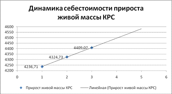 Рис. 3. График изменения себестоимости прироста живой массы КРС за период 2006-2008 гг. Прогнозное значение себестоимости прироста живой массы КРС составляет в 2010 г. 4400 руб./ц.