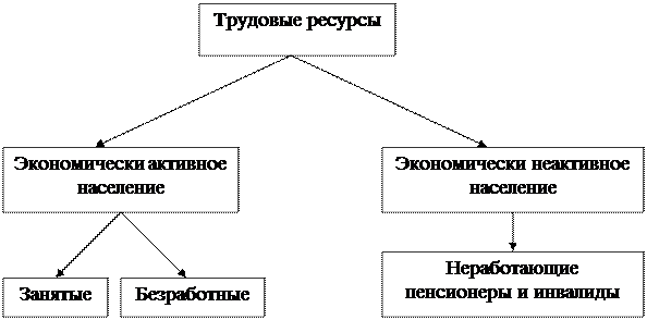 Рисунок 1.1 – Состав трудовых ресурсов В зависимости от способности к труду различают трудоспособных и нетрудоспособных, то есть люди могут быть нетрудоспособны в трудоспособном возрасте (инвалиды I и II групп; лица, получающие пенсию на льготных условиях) и трудоспособными в нетрудоспособном возрасте (работающие подростки и работающие пенсионеры) [5, c.79] Таким образом, к трудовым ресурсам относятся: · население в трудоспособном возрасте, за исключением инвалидов войны и труда I и II групп и неработающих лиц, получающих пенсии на льготных условиях; · работающие лица пенсионного возраста; · работающие подростки в возрасте до 16 лет. Основную часть трудовых ресурсов составляет население в трудоспособном возрасте. В мировой практике широко используется классификация, предложенная Международной организацией труда, в соответствии с которой население делится на экономически активное и экономически неактивное [5, c.79]. Экономически активное население — это часть населения, которая обеспечивает предложение рабочей силы для производства товаров и услуг, включающая занятых и безработных [3, c.209]. Граждане считаются занятыми: · работающие по найму на условиях полного и неполного рабочего времени, включая сезонные и временные работы; · занимающиеся предпринимательской деятельностью; · самостоятельно обеспечивающие себя работой; · занятые в подсобных промыслах и реализующие продукцию по договорам; · выполняющие работу по гражданско-правовым договорам, а также члены производственных кооперативов. Безработные — это трудоспособные граждане, не имеющие работы и заработка, зарегистрированные в службе занятости в целях поиска подходящей работы [3, c209]. Экономически неактивное население — это население, которое не входит в состав экономически активного населения и включая следующие категории: · учащиеся и студенты, слушатели и курсанты, аспиранты и докторанты дневной формы обучения; · лица, получающие пенсии по старости и на льготных уcловиях, а также получающие пенсии по случаю потери кормильца при достижении ими пенсионного возраста; · лица, получающие пенсии по инвалидности (1, 2, 3 группы); · лица, занятые ведением домашнего хозяйства, уходом за детьми, больными родственниками и т.п.; · лица, отчаявшиеся найти работу, т.е. прекратившие поиск работы; · лица, у которых нет необходимости работать, независимо от источника дохода. В современных условиях реальное значение для экономики имеет численность экономически активного населения - рабочей силы как фактора, образующего рынок труда. Изменение численности трудовых ресурсов зависит от естественного движения населения, рождаемости и смертности. Рождаемость на изменении трудовых ресурсов сказывается лишь через 16 лет. Меняется также соотношение численности поколений, вступающих в трудоспособный возраст и переходящих в пенсионный возраст. Поэтому удельный вес трудоспособного населения колеблется [5, c.80]. Структура трудовых ресурсов многогранна и включает различные компоненты и характеристики трудовых ресурсов.