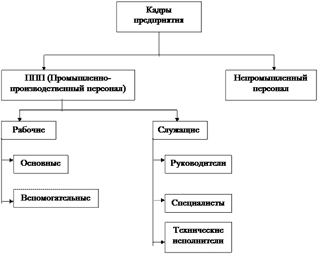 Рисунок 1.3 – Структура кадров предприятия Кадры предприятия, непосредственно связанные с процессом производства, т.е. занятые основной производственной деятельностью, представляют промышленно-производственный персонал (ППП), к которому относятся все занятые в производственной деятельности и обслуживании производства работники основных и вспомогательных цехов, аппарата заводоуправления, лабораторий, научно-исследовательских и опытно-конструкторских отделов, вычислительных центров. Кроме того, предприятие может иметь персонал непромышленных подразделений — работники, занятые в жилищном, коммунальном и подсобном хозяйствах, здравпунктах, профилакториях, учебных заведениях [5, c.85, 87-88]. Работники ППП подразделяются на две основные группы — рабочие и служащие. Промышленно-производственный персонал по выполняемым функциям делится на следующие группы [5, c.89]: · Рабочие. Они делятся на основных и вспомогательных. Основные рабочие осуществляют производство профилирующей продукции предприятия. Вспомогательные - обслуживают производство. · Руководители - работники, занимающие должности руководителей предприятия и их структурных подразделений, а также их заместители по следующим должностям: директора, начальники, управляющие, заведующие на предприятии, в структурных единицах и подразделениях; главные специалисты (главный бухгалтер, главный инженер, главный механик, главный технолог, главный экономист и др.); · Специалисты - работники, занятые инженерно-техническими, экономическими, бухгалтерскими, юридическими и другими аналогичными видами деятельности; · Технические исполнители - работники, осуществляющие подготовку и оформление документации, учет и контроль, хозяйственное обслуживание и делопроизводство (агенты, кассиры, контролеры, делопроизводители, учетчики, чертежники и др.). Качественная характеристика персонала фирмы определяется степенью профессиональной и квалификационной пригодности ее работников для достижения целей фирмы и производства работ. Профессия подразумевает особый вид трудовой деятельности, требующий определенных теоретических знаний и практических навыков [13, c.143]. Примерами профессий и специальностей могут быть: для рабочих - токарь (профессия) делится но специальности: токарь - карусельщик, токарь - расточник и другие; для АУП - экономист (профессия) делится на специальности: плановик, финансист, маркетолог и т.д. Специальность — это вид деятельности в пределах профессии, который имеет специфические особенности и требует от работников дополнительных специальных знаний и навыков [13, c.143]. Работники каждой профессии и специальности различаются по уровню квалификации. Квалификация характеризует степень овладения работником тон или иной профессией, специальностью и отражается в квалификационных (тарифных) разрядах и категориях [13, c.144]. Тарифные разряды и категории — это одновременно и показатели, характеризующие степень сложности работ. По уровню квалификации специалистов каждой категории можно разделить на четыре группы. Так для рабочих эти группы будут, по мере возрастания квалификации, называться [13, c.144]: · неквалифицированные рабочие, не имеющие специальной подготовки; · малоквалифицированные, то есть рабочие прошедшие подготовку в течение короткого времени; · квалифицированн