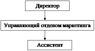 Целевой сегмент рынка — один или несколько сегментов, отобранных для маркетинговой деятельности фирмы. При этом центр «Арион» должен с учетом выбранных целей определить сильные стороны конкуренции. Цели могут касаться вывода новых товаров или проникновения известных товаров на новые сегменты рынка. При этом сегмент должен быть достаточно емким и стабильным, чтобы быть выбранным в качестве целевого. Целевой сегмент также отражен в таблице 2 (выделенные ячейки).[11] После определения целевого сегмента рынка центр свадебной фотографии «Арион» должен изучить свойства и образ товаров конкурентов и оценить положение своего товара на рынке. Изучив позиции конкурентов, фирма принимает решение о позиционировании своего товара, то есть об обеспечении конкурентоспособного положения товара на рынке. Позиционирование товара на избранном рынке — это логическое продолжение нахождения целевых сегментов, поскольку позиция товара на одном сегменте рынка может отличаться от того, как его воспринимают покупатели на другом сегменте.[12] Если сегментирование дает характеристики, которые должен иметь продукт с точки зрения желаний и предпочтений, то позиционирование убеждает потребителей, что им предлагается именно тот товар, который они хотели бы приобрести. Выбор схемы маркетингового отдела центра свадебной фотографии «Арион». Претворение в жизнь маркетинговых мероприятий требует системы управления маркетингом, которая включает планирование маркетинга, состоящего из стратегического и тактического (текущего) планирования, организацию управления и контроль. Но так как магазин только начинает развиваться и предполагает небольшую организационную структуры, то и отдел маркетинга будет состоять из управляющего им и ассистента. Управляющий подчиняется непосредственно директору магазина, а ассистент является помощником и заместителем управляющего отделом маркетинга. Схема отдела представлена на рисунке 2.