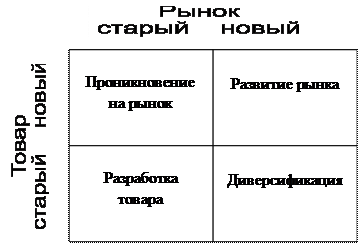 Рис. 1 Структура стратегического планирования Процесс стратегического планирования включает: • определение миссии предприятия, организации; • формулирование целей и задач функционирования предприятия, организации; • оценку и анализ внешней среды; • оценку и анализ внутренней структуры; • разработку и анализ стратегических альтернатив; • выбор стратегии. Процесс стратегического управления (кроме стратегического планирования) включает также: • реализацию стратегии; • оценку и контроль выполнения стратегии. Как видно из рис. 1, стратегическое планирование является одним из компонентов стратегического управления. Стратегическое управление иногда рассматривается как синоним термина «стратегическое планирование». Однако это не так. Стратегическое управление помимо стратегического планирования содержит механизм реализации решений. Стратегия маркетинга определяет, как нужно применять структуру маркетинга, чтобы привлечь и удовлетворить целевые рынки и достичь целей организации. В решениях о структуре маркетинга главное - планирование продукции, сбыт, продвижение и цена. Стратегия должна быть максимально ясной. (Например, планирование новой продукции должно предусматривать установление приоритетов, распределение ответственности, временной и производственный графики, поддержку продвижения и потребности в обучении персонала.) Часто фирма выбирает стратегию из двух и более возможных вариантов. Например, компания, которая хочет увеличить свою долю на рынке до 40%, может сделать это несколькими путями: создать более благоприятный образ товара через интенсивную рекламу; увеличить численность торгового персонала; представить новую модель; понизить цены и продавать через большое число розничных магазинов; Эффективно объединить и скоординировать все эти элементы маркетинга. Каждая из альтернатив открывает различные возможности для маркетологов. Например, ценовая стратегия может быть очень гибкой, поскольку цены менять легче, чем создавать различные модификации товара. Однако стратегию, базирующуюся на низких ценах, легче всего скопировать. Кроме того, удачная ценовая стратегия может привести к ценовой войне, которая очень плохо подействует на чистую прибыль. В отличие от этого стратегию, основанную на преимуществах размещения, трудно копировать в силу длительных сроков аренды и недоступности подходящих мест для конкурентов. Но она может быть негибкой и плохо адаптироваться к изменениям окружающей среды. Четыре подхода к планированию стратегии представлены в следующих подразделах: матрица возможностей по товарам/рынкам, матрица "Бостон консалтинг груп", воздействие рыночной стратегии на прибыль (PIMS) и общая стратегическая модель Портера (в рамках всех этих подходов организация отдельно оценивает и использует все свои возможности, товары и направления деятельности. На основе этих оценок распределяются усилия и ресурсы компании, а также разрабатываются соответствующие стратегии маркетинга.) Матрица возможностей по товарам/рынкам Матрица возможностей по товарам/рынкам предусматривает использование четырех альтернативных стратегий маркетинга для сохранения и/или увеличения сбыта: проникновение на рынок, развитие рынка, разработка товара и диверсификация (рис. 2)