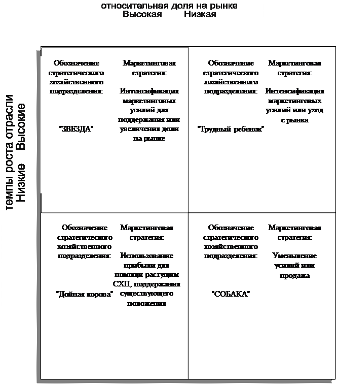 Выбор стратегии зависит от степени насыщенности рынка и возможности компании постоянно обновлять производство. Две или более стратегии могут сочетаться. Стратегия проникновения на рынок эффективна, когда рынок растет или еще не насыщен. Фирма расширить сбыт имеющихся товаров на существующих рынках при помощи интенсификации товародвижения, наступательного продвижения и самых конкурентоспособных цен. Это увеличивает сбыт: привлекает тех, кто раньше не пользовался продукцией данной фирмы, а также клиентов конкурентов и увеличивает спрос уже привлеченных потребителей. Стратегия развития рынка эффективна, если: местная фирма стремится расширить свой рынок; в результате изменения стиля жизни и демографических факторов возникают новые сегменты на рынке; для хорошо известной продукции выявляются новые области применения. Фирма стремится увеличить сбыт существующих товаров на рынках или побудить потребителей по-новому использовать существующую продукцию. Она может проникать на новые географические рынки; выходить на новые сегменты рынка, спрос на которых еще не удовлетворен; по-новому предлагать существующие товары; использовать новые методы распределения и сбыта; сделеть более насыщенными усилия по продвижению. Стратегия разработки товара эффективна, когда фирма имеет ряд успешных торговых марок и пользуется приверженностью потребителей. Фирма разрабатывает новые или модифицированные товары для существующих рынков. Она делает упор на новые модели, улучшение качества и другие мелкие инновации, тесно связанные с уже внедренными товарами, и реализует их потребителям, лояльно настроенным по отношению к данной компании и ее торговым маркам. Используются традиционные методы сбыта; продвижение делает упор на то, что новые товары выпускаются хорошо известной фирмой. Стратегия диверсификации используется для того, чтобы фирма не стала чересчур зависимой от одной ассортиментной группы. Фирма начинает выпуск новых товаров, ориентированных на новые рынки. Цели распределения, сбыта и продвижения отличаются от традиционных для фирмы. Матрица "Бостон консалтинг групп" Матрица "Бостон консалтинг групп" позволяет компании классифицировать каждую ассортиментную группу по ее доле на рынке относительно основных конкурентов и темпам годового роста отрасли. Используя матрицу, фирма может определить, во-первых, какое из ее подразделений играет ведущую роль по сравнению с конкурентами и, во-вторых, какова динамика ее рынков: развиваются они, стабилизируются или сокращаются. В основе матрицы лежит предположение, что чем больше доля подразделения на рынке, тем ниже относительные издержки и выше прибыль в результате экономии от масштабов производства, накопления опыта и улучшении позиции при заключении сделок. Матрица выделяет четыре типа подразделений: "звезды", "дойные коровы", "трудные дети" и "собаки" и предполагает стратегии для каждого из них (рис. 3). "Звезда" занимает лидирующее положение в развивающейся отрасли. Основная цель - поддержать отличительное преимущество фирмы в условиях растущей конкуренции. "Звезда" дает значительные прибыли, но требует больших объемов ресурсов для финансирования продолжающегося роста. Долю на рынке можно поддерживать или увеличивать за счет снижения цены, большой объем рекламы, изменени