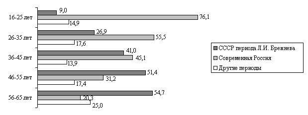 Выражая свое отношение к различным периодам советской истории, население определенно симпатизирует «эпохе застоя» времен Л. Брежнева (причем, чем старше респонденты, тем это выглядит определеннее). Именно с этим периодом три четверти россиян ассоциируют социальную защищенность, которой так не хватает в современной жизни. Подобная защищенность, а также относительная устойчивость экономического положения страны (от половины до двух третей россиян в разных возрастных когортах без сомнений уверены, что именно в эру расцвета СССР, благодаря мощной промышленности и социальной стабильности, были достигнуты основные успехи в науке, образовании, искусстве) давали советским гражданам ощущение жизнерадостности, доверия, гордости за свою страну – по всем этим показателям так называемый «застой» явно опережает любой другой советский исторический период в массовом сознании россиян. Даже такой элемент советского строя, как засилье бюрократии, постепенно стирается из исторической памяти, как неотъемлемый признак этого строя. Видимо, россияне поняли, что бюрократии не меньше, а то и больше, и в современной России, поэтому ассоциируют ее с периодом «застоя» почти в два раза реже, чем делали это в 1998 году. Надо сказать, что восприятие различных периодов истории России во многом связано с событиями 90-х годов. Именно с началом перехода к рынку начинает меняться историческое мировосприятие наших сограждан (прежде всего, это касается истории ХХ века). Возникла и в определенной степени стала поддерживаться на государственном уровне волна ностальгии и интереса к истории дореволюционной России. Однако, особого успеха идеи «самодержавия, православия и народности» у населения так и не получили: по данным настоящего исследования, большинство положительных ассоциативных позиций, связанных с Россией до 1917 года, медленно, но верно утрачивают свою популярность. Так, в 2004 г. практически в полтора раза меньше опрошенных, чем в 1998 г., отметили такие характерные черты царской России, как уважение к православной церкви (соответственно 49,2% и 65%), любовь к Отечеству (20,3% и 28,9%), наличие идеалов (12,9% и 18,3%). В два раза меньше россиян посчитало, что дореволюционный период отличался бурным экономическим развитием (11,7% и 21,1%). Вместе с тем, молодое поколение россиян в настоящее время все-таки более позитивно воспринимает то, что имело место в России до революции 1917 года (каждый третий опрошенный моложе 35 лет уверен, что в XIX – начале XX вв. в России наблюдался расцвет искусства; каждый пятый убежден, что именно тогда в наибольшей степени проявляло себя доверие между людьми). Россияне старше 45 лет разделяют подобные точки зрения в каждом пятом и каждом десятом случае соответственно. Кроме того, перестройка и гласность в России сосредоточили беспрецедентное общественное внимание на прояснении так называемых «белых пятен» отечественной истории, и этот процесс сопровождался чередой шокирующих разоблачений, исторических расследований и переоценкой многих прокоммунистических ценностей. Основным объектом социально-политической критики и человеческого возмущения является эпоха И.В. Сталина, представленная в массовом сознании как эпоха геноцида, политических репрессий и подавления основных гражданских прав и свобод личности. С другой стороны, россияне до сих пор 