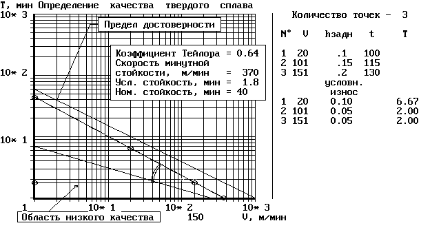 при назначении режимов обработки для резцов, работающих на станках с ЧПУ или в составе ОЦ и ГАП. Методика ускоренных испытаний сопровождается программой обработки результатов измерений на любом ПК, поскольку составлена на доступном языке Бейсик, с распечаткой результатов в виде протокола и представлением его на экране дисплея в виде наглядного графика (рис. 102)
