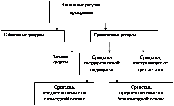 Рис. 1.1 – Классификация финансовых ресурсов предприятий Собственные финансовые ресурсы предприятий образуются за счет прибыли от реализации продукции (работ, услуг), прибыли от прочей реализации, прочие операционные доходы. В состав источников собственных финансовых ресурсов включаются также личные средства собственника, первоначальные взносы учредителей. Предприятия и организации в своей деятельности опираются, прежде всего, на собственные источники. Однако необходимо отметить, что данный источник ограничивает рост предприятия, поскольку он зависит от темпов роста прибыли (вкладов собственников)[1] . В соответствии с данной классификацией, привлеченные финансовые ресурсы предприятий, разделяют на три большие группы: заемные средства, средства государственной поддержки и средства, поступающие от третьих лиц. Привлеченные финансовые ресурсы формируются на основе перераспределения средств между хозяйствующими субъектами и характеризуют степень взаимодействия предприятия с ними. Источниками привлеченных заемных финансовых ресурсов предприятий являются кредиты коммерческих банков и небанковских организаций, займы, частные кредиты. В особую группу можно выделить финансовые ресурсы в виде средств государственной поддержки. На сегодняшний день государство начинает все больше влиять на деятельность и финансовую устойчивость предприятий и организаций как в виде прямой, так и в виде косвенной финансовой поддержки с целью поощрения и стимулирования инвестиционной активности бизнеса. В этой связи целесообразно выделение данного вида финансовых ресурсов в отдельную группу, в том числе и по причине того, что данные источники зачастую имеют нерыночную природу, связанную с протекционистской государственной политикой, а также преследуют социальные, политические и иные цели. Источником их образования являются средства, которые предоставляются на возмездной основе и предполагают их возврат - бюджетный кредит, беспроцентные ссуды, краткосрочные займы, программы кредитования. Также источниками выступают средства, предоставляемые на безвозмездной основе, с целью более эффективного перераспределения ресурсов между отраслями экономики, а также для решения других социально-экономических проблем. Среди данных форм поддержки можно выделить субвенции, субсидии, дотации (бюджетные ассигнования, бюджетные инвестиции). Источником средств, привлеченных от третьих лиц являются ресурсы, полученные от юридических и физических лиц, поступлении из отраслевых и научно-исследовательских фондов, благотворительные взносы, финансовые ресурсы, поступающие от союзов, ассоциаций, отраслевых региональных структур, гранты от общественных организаций, международных организаций, благотворительных фондов и др.[2] Данная классификация отражает специфику финансового обеспечения деятельности бизнеса, т.к. собственные средства являются опорой деятельности предприятий, а привлеченные средства господдержки преимущественно ориентированы на поддержку хозяйствующих субъектов. Также данная классификация определяет характер взаимодействия предприятий и организаций с внешней средой и облегчает управление финансовыми ресурсами. Собственный капитал характеризует общую стоимость средств предприятия, принадлежащих ему на праве собс