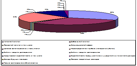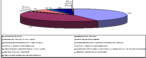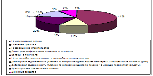Рисунок 2.2 – Структура активов в 2007 году Наибольшая доля в структуре активов ООО «Глобал Гейм» принадлежит основным средствам. В 2006 г. она составила 54%, в 2007 г.- 50%, и в 2008 г. – 45%. Вторая по величине доля в активах принадлежит запасам. В 2006 г и 2007 г – их доля составляет 26%, а в 2008 г. – 20%. Третий по величине показатель структуры активов – нематериальные активы. Их доля за исследуемый период колеблется в пределах 12-15%. Возрастает доля незавершенного строительства. В 2006 г. она составляла 3%, в 2007 г. – 4%, а в 2008 выросла до 11%.