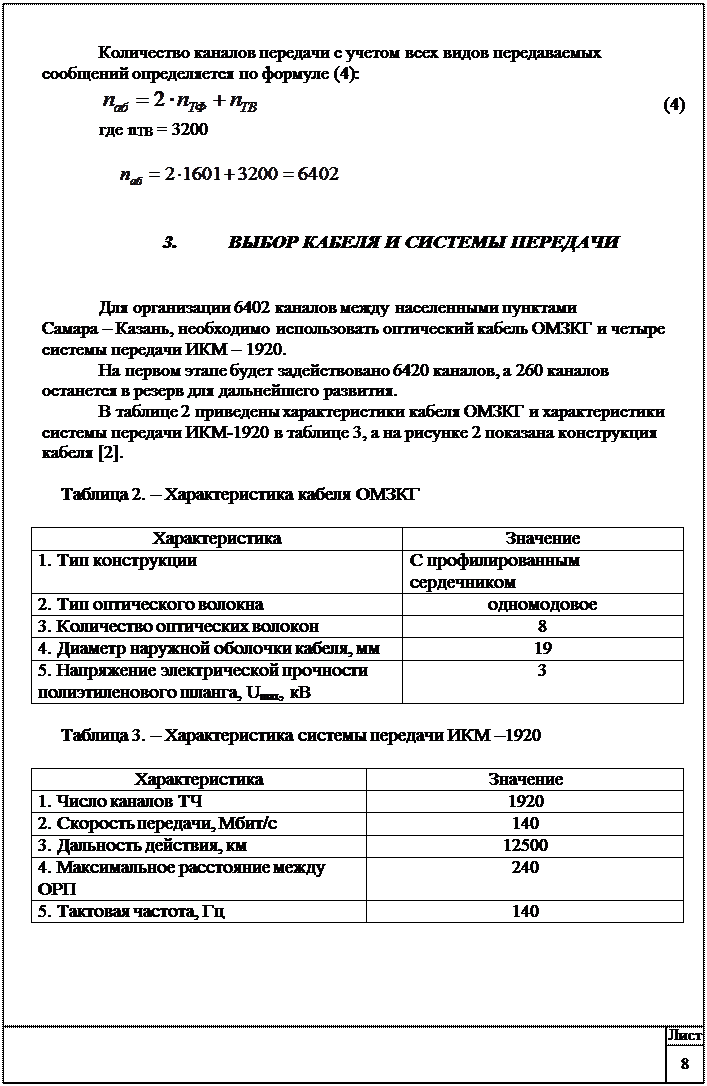 – для 6680 каналов задействованных на первом этапе. 8. ЗАКЛЮЧЕНИЕ Для организации 6402 каналов между городами Самара и Казань проектом предусматривается: 1) Прокладка кабеля ОМЗКГ, содержащего восемь волокон; 2) Использование четырёх систем передачи ИКМ-1920; 3) На первом этапе задействовать 6420 ТЧ, а 260 каналов ТЧ оставить на резерв для дальнейшего развития; 4) Установка ОРП не предусмотрена; 5) Разместить по трассе ВОЛП десять НРП (необслуживаемых регенерационных пунктов).