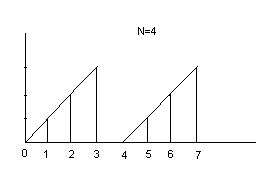 Рисунок 1.1.3 К настоящему времени синтезаторы частот рассматриваемого типа еще не построены, поскольку существует опасение, что в такой системе будут накапливаться нежелательные шумы квантования. С другой стороны, из теории предельных циклов следует, что устойчивые колебания всегда будут иметь место. Однако неясно, будут ли они пригодны для получения чисто синусоидальных аналоговых колебаний. Еще одной причиной, препятствовавшей созданию устройства рассматриваемого типа, является неравномерность сетки часто, связанная с квантованием коэффициентов. Третий способ получается сочетанием первых двух. Он заключается в использовании и вычислений и таблицы синусов. В техническом задании указано, что кроме гармонического сигнала, проектируемое устройство должно формировать меандр и пилообразный сигнал. Формирование пилообразного сигнала и меандра с различной скважностью проще всего реализовать вычислением отсчетов по соответствующим формулам. Для пилообразного сигнала: y(n)= kd, k= ( n mod N), в – константа Mod – операция взятия остатка от деления нацело. На рисунке 1.1.4 показан пилообразный сигнал, сформированный по этой формуле.