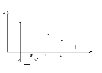 Рисунок 1.1.5 Принимая во внимание все выше сказанное, было принято решение для получения точного гармонического сигнала формировать отсчеты с помощью вычислений, причем чтобы исключить накопление шумов квантования вычисления производятся с помощью прямой формулы (y(n)= Acos(2πfnT), где f – частота, Т – интервал дискретизации), а не рекурсивной. Вычисления отсчетов в реальном масштабе времени (т.е. одновременно с генерацией сигнала) требуют достаточно быстродействующего, а, следовательно, и дорогого, микропроцессора. Поэтому принято решение перед началом генерации вычислять массив отсчетов подлежащего генерации сигнала и записывать его в оперативное запоминающее устройство. Требования к системе позволяют применить данный способ формирования сигнала. Размер массива рассчитывается таким образом, чтобы в него укладывалось не менее одного периода, подлежащего генерации сигнала. Генерация сигнала производится периодическим повторением вычисленного фрагмента. Оценим необходимый размер буфера для массива отсчетов, подлежащего генерации сигнала. Из курса теории сигналов, известно, что импульсный периодический сигнал имеет дискретный спектр. Спектр периодического сигнала представлен на рисунке 1.1.6.