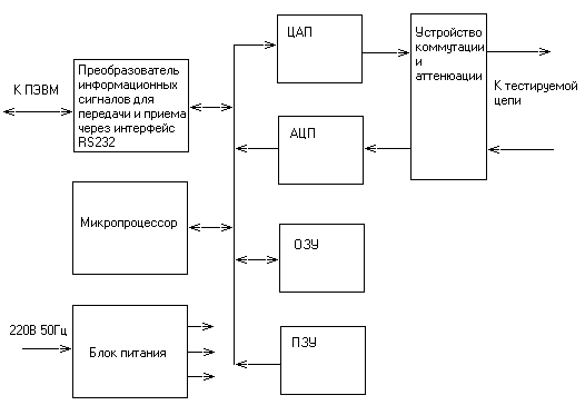 Рисунок 1.2.1 Управляя затуханием (усилением) входного сигнала с помощью ЦАП, добиваемся такого размаха сигнала, который обеспечивал бы максимальное использование динамического диапазона АЦП (Аналого-цифровой преобразователь), включенного сразу после устройства коммутации и аттенюации. Максимальное использование динамического диапазона позволяет получить наилучшую точность определения амплитуды входного сигнала. Для функционирования всех элементов данного устройства необходим источник питания. Поскольку данное устройство будет эксплуатироваться в помещениях, а основным источником питания в помещениях является электрическая сеть с переменным напряжением 220В 50Гц, блок питания данного устройства должен обеспечивать преобразование данного напряжения. В проектируемом устройстве для питания большинства микросхем необходимо постоянное напряжение 5В. В схеме присутствуют операционные усилители, для питания которых используется разно полярное напряжение. Для обеспечения необходимого динамического диапазона генерируемых и анализируемых сигналов напряжение питания операционных усилителей должно быть +15В и –15В. Таким образом для функционирования проектируемого устройства необходим блок питания, преобразующий переменное напряжение 220В 50Гц в постоянное напряжение +5В, +15В и –15В. Структурная схема измерителя показана на рисунке 1.2.2