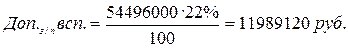 – доплата к прямой зарплате вспомогательных рабочих, Подстановкой значений в формулу (2.15) получено: Итого основная заработная плата по служащим, Итогосл. , руб., определяется по формуле: где Прям.з/п – прямая заработная плата по служащим; Прям.з/п = =7781400 руб.; рассчитана по формуле (2.10); ЗДОПсл. - доплата к прямой зарплате служащих, ЗДОП сл. = 3112560 руб.; по формуле (2.13); Подстановкой значений в формулу (2.16) получено: Дополнительная заработная плата, Допз/п осн. , руб., определяется по количеству основных рабочих: где Итогоосн.. – итоговая основная заработная плата производственных рабочих; Итогоосн.. = 197490000 руб.; рассчитана по формуле (2.14); ПрДоп.з/п - процент дополнительной заработной платы, ПрДоп.з/п = 22%, п.17, приложение А. Подстановкой данных в формулу (2.17) получено: Дополнительная заработная плата по вспомогательным рабочим, Доп.з/п всп., руб., определяется по формуле: где Итоговсп. – итоговая основная заработная плата вспомогательных рабочих; Итоговсп. = 54496000 руб.; по формуле (2.15); ПрДоп.з/п – процент дополнительной заработной платы для вспомогательных рабочих; ПрДоп.з/п = 22%; п.17, приложение А. Подстановкой данных в формулу (2.18) получено: Дополнительная заработная плата для служащих, Доп.з/псл., руб., определяется по формуле: где Итогосл.