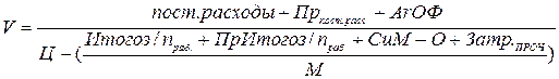 Заключение На основании исходных данных курсовой работы рассчитывались показатели, влияющие на точку безубыточности. Точкой безубыточности называется такой объем реализации продукции, при котором полученные доходы обеспечивают возмещения всех затрат и расходов, но не дают возможности получать прибыль, то есть это нижний предельный объем выпуска продукции, при котором прибыль равна нулю. Точка безубыточности характеризуется следующими показателями: - критический объем реализации продукции, V , шт.; - порог рентабельности, Пр , руб.; - запас финансовой прочности, зфп, руб.; - маржа (предел) безопасности, маржа , шт. Расчет был произведен по второму варианту, т.е. по четырем годам, взятых из п.7 приложения А. Критический объем реализации, V , шт., определяется по формуле: где пост.расходы – постоянные расходы; пост.расходы = 13617450 руб.; пост.расходы = Итогосл. = рассчитаны по формуле (2.20); Прпост.расх. – процент постоянных расходов; Прпост.расх. = 3540537 руб.; определяется как 26% от постоянных расходов, пост.расходы , руб., рассчитанных по формуле (2.20); А rОФ – амортизационные отчисления основных фондов; АrОФ = =1092824 руб.; рассчитаны по формуле (2.27); Ц – договорная цена одного изделия, Ц = 150 руб.; п.8, приложение А; Итогоз/праб. – итоговый годовой фонд заработной платы рабочих; Итогоз/праб. = 307422920 руб.; из таблицы 2.2 столбец 8. ; Пр