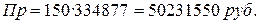 СиМ – сырье и материалы; СиМ = 8943800 руб.; рассчитаны по формуле (2.22); О – отходы; О = 3577520 руб.; рассчитаны по формуле (2.23); Затр.проч. – затраты прочие; Затр.проч. = 40927063 руб.; рассчитаны по формуле (2.28). М – производственная мощность; М = 4540000 руб; из расчета подраздела 3.1, страница 12. Подстановкой данных в формулу (1) рассчитано: Порог рентабельности, Пр , руб., определяется по формуле: где Ц – договорная цена одного изделия, Ц = 150 руб., п.8, приложение А; V – критический объем реализации, V = 334877 шт., определяется по формуле (1). Подстановкой данных в формулу (2) получено: Запас финансовой прочности, зфп , руб., определяется по формуле: где В – выручка от реализации продукции; В = 681000000 руб.; определяется по формуле (2.46); Пр = 50231550 руб.; определяется по формуле (2). Подстановкой расчетов в формулу (3) получается: Маржа (предел) безопасности, маржа, руб., определяется по формуле: где V – критический объем реализации, V = 334877 шт., определяется по формуле (1). М – производственная мощность; М = 4540000 руб; из расчета подраздела 3.1, страница 12. Подстановкой расчетов в формулу (4) получено: График точки безубыточности представлен на рисунке 1.