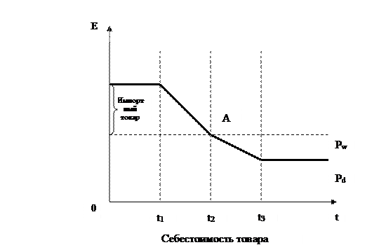 Рис. 4. Защита промышленности с помощью импортного тарифа Находясь под защитой импортного тарифа, новая отрасль промышленности совершенствует производство, растет его эффективность, снижается себестоимость (t 1 t 2 ). В точке А внутренняя цена товара Pd сближается с мировой Pw .Таможенный тариф отменяется. Открывшись международной конкуренции, страна продолжает увеличивать эффективность своего производства (t 2 t 3 ). Внутренняя цена снижается до уровня ниже мировой, что позволяет стране начать самой экспортировать товары новых отраслей за рубеж. Данный аргумент в защиту импортного тарифа имеет явные недостатки. Во-первых, очень трудно точно определить, когда новая промышленность достигла уровня зрелости, достаточного для того, чтобы снять защитный тариф. Всегда найдутся группы, заинтересованные в продолжении существования тарифа, которые будут убеждать в обратном, в результате чего устранение однажды введенною тарифа может оказаться политически очень непростым делом. Во-вторых, очень сложно определить те отрасли, которые в течение разумного промежутка времени смогут под защитой тарифа развиться настолько, чтобы стать конкурентоспособными на мировом рынке. Специальные исследования на примере отдельных стран не подтверждают, что в защищаемых отраслях издержки сокращаются быстрее, чем в незащищаемых. В-третьих, данный аргумент не применим к развитым индустриальным странам, которые не могут сослаться на недостаточную развитость новых отраслей, но все же используют тарифы как средство таможенной политики. Тариф — средство стимулирования отечественного производства. Этот аргумент, интенсивно эксплуатировавшийся развивающимися странами, был несколько позже подхвачен и в России. Поскольку местная промышленность не в состоянии конкурировать с более дешевыми товарами, производимыми за рубежом, с помощью более совершенной технологии, то, таким образом, она нуждается в защите тарифом. Более того, его отсутствие может привести к потере рабочих мест в результате сокращения производства, что вызовет дополнительные расходы бюджета, делая необходимыми выплаты пособий по безработице. В результате растущей безработицы упадет жизненный уровень, возникнут социальные трения. Сторонники этого аргумента пренебрегают перераспределительным характером любого тарифа, который может обеспечить одной стране выгоду только за счет другой. Страны, сокращая с помощью тарифа импорт и сохраняя занятость в отраслях, конкурирующих с импортом, косвенно сокращают и свой экспорт. Из-за тарифа иностранные партнеры получают за свой экспорт меньшую выручку, которую можно было бы использовать на закупку товаров, экспортируемых данной страной. Тариф — важный источник бюджетных доходов. Этот аргумент в пользу введения таможенных тарифов также традиционно активно эксплуатируется развивающимися странами и странами с переходной экономикой, включая Российскую Федерацию. В России доходы от таможенных пошлин составляют примерно до 40% доходной части бюджета, причем эта доля с начала 1990-х гг. постепенно росла. В России структура государственных доходов от таможенных пошлин значительно отличается от большинства стран — 3/4 доходов ранее приходилось на экспортный тариф и только 1/4 — на импортные пошлины. Налог на импорт или экспорт, каковыми являются 