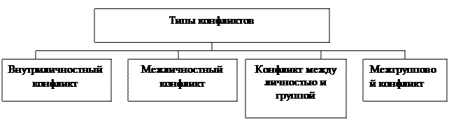 Рисунок 1.1 – Основные типы конфликтов 1) Внутриличностный конфликт. Он возникает тогда, когда к одному человеку предъявляются противоречивые требования [8]. Внутриличностный конфликт может также возникнуть в результате того, что производственные требования не согласуются с личностными потребностями или ценностями. Внутриличностный конфликт проявляется как ответ на рабочую перегрузку или недогрузку. 2) Межличностный конфликт. Этот тип конфликта наиболее распространенный. Чаще всего это борьба руководителя за ограниченные ресурсы, рабочую силу, финансы и т.п. [8]. Межличностный конфликт может также проявляться и как столкновение личностей, т.е. люди с разными характерами, несовместимыми темпераментами просто не в состоянии ладить друг с другом. 3) Конфликт между личностью и группой. В связи с тем, что производственные группы устанавливают нормы поведения и выработки, бывает так, что ожидания группы находятся в противоречии с ожиданиями отдельной личности [8]. В этом случае возникает конфликт 4) Межгрупповой конфликт. Как известно, организации состоят из множества как формальных, так и неформальных групп. Даже в самых лучших организациях между ними могут возникнуть конфликты. Кроме того, конфликты классифицируют и по степени проявления: скрытый и открытый. [4] Каждый конфликт имеет также более или менее четко выраженную структуру [8]. На рисунке 1.2 представлена модель конфликта.