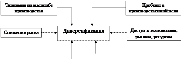 Рис.1.1 Мотивы диверсификации [2, 155] 1.2 МОТИВЫ И ЦЕЛЕСООБРАЗНОСТЬ ДИВЕРСИФИКАЦИИ ПРОИЗВОДСТВА Пока компания получает прибыль в уже освоенной отрасли, необходимости в диверсификации нет. Однако по мере замедления роста диверсификации становится привлекательным средством улучшения перспектив компании. Диверсификации возможно и в том случае, если у компании есть технологический разработки, ключевые компетенции или ресурсная база для успешной конкуренции в других отраслях. Существует несколько причин для проведения диверсификации. 1. Преимущество диверсификации в том, что покупатель рассматривает ситуацию как получение исключительных рыночных возможностей. Как правило, такая ситуация характерна для быстро растущего рынка, когда появляются исключительные возможности для действий, поскольку в это время снижается накал конкурентной борьбы. Активно действующий участник рынка получает реальную возможность доминировать на таком рынке и получать более высокую прибыль. Недостатки. Успешного поглощения можно ожидать, когда имеется соответствие между рыночными возможностями, создаваемыми такой сделкой, и ресурсами и топ-характеристиками компании. Поэтому прежде, чем приобретать компанию, следует попытаться найти ответы на следующие вопросы: "Что может предложить наша компания, чтобы потребитель смог воспользоваться новыми возможностями? Можем ли мы предложить нечто эксклюзивное - то, что другие предложить не могут?". Например, IBM и Kodak. одно время активно конкурировали в отрасли копировального оборудования. Но IBM в конце концов покинула ее, а Kodak продолжает действовать на этом рынке. Конкурентным преимуществом Kodak стало владение эксклюзивными сведениями в области технологии копирования, которых не было у IBM. В настоящее время Kodak продолжает использовать свою технологию. Заключен стратегический союз с японской компанией Danka, согласно которому Kodak. осуществляет исследования, занимается разработками новых моделей и производством; Danka отвечает за все маркетинговые действия, продажи и виды деятельности, связанные с менеджментом на местах. 2. Диверсификация как средство, компенсирующее низкий потенциал роста. Компании, действующие на зрелых рынках, часто не могут расти, не прибегая к диверсификации, т.е. не занимаясь многими видами бизнеса. Недостатки. Раннее осознание ограниченных возможностей конкретного бизнеса свидетельствует о проницательности менеджеров, но это отнюдь не означает, что иные виды бизнеса будут иметь более широкие возможности. Для успешных действий в сложившихся видах бизнеса менеджеру требуется несколько другой склад ума и совершенно иной подход к рынку, нежели при работе в быстро растущих видах бизнеса. Например, в свое время компания R.J. Reynolds провела диверсификацию из-за уменьшения возможностей табачного бизнеса, которым занималась много лет. В 70-х годах компания осуществила несколько спорных поглощений. Выход на рынок продуктов питания в 80-е годы также оказался неудачным. Надо сказать, что доходы акционеров стали бы больше, если бы деньги, затраченные на диверсификацию, были просто распределены между ними. 3. Проведение диверсификации с целью создать более стабильный поток поступлений. Финансисты Уолл-стрита ненавидят неожиданности и очень любят предсказуемость. Компании с более стабильными пос