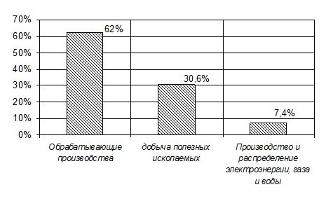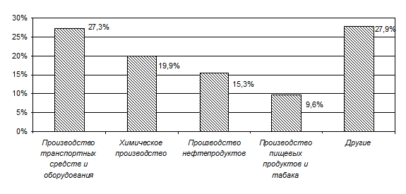 Рисунок 2.1 Структура промышленности [4] В обрабатывающих производствах наибольший удельный вес занимают производство транспортных средств и оборудования — 27,3 %, химическое производство — 19,9 %, производство нефтепродуктов — 15,3 %, производство пищевых продуктов — 9,6 % (Рис. 2.2).