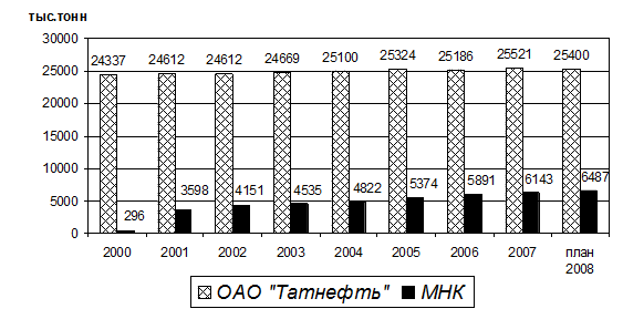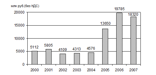 Рис. 2.4 Динамика добычи нефти ОАО «Татнефть» и МНК [4] В 2007 г. доля добычи нефти малыми нефтедобывающими компаниями в общей добыче нефти по республике составила 19,3 % (в 2006 г. эта доля составляла 19 %). Особенность малого бизнеса в нефтедобыче состоит в том, что малые нефтедобывающие компании в отличие от вертикально-интегрированных компаний разрабатывают маргинальные месторождения с трудноизвлекаемыми запасами, содержащими высокосернистые нефти, большинство из которых открыты около трех десятилетий назад. Создание новых нефтяных компаний способствовало появлению новых инновационных технологий, новых методов увеличения нефтеотдачи и стимулирования добычи. Каждая десятая тонна нефти малыми нефтяными компаниями добывалась за счет применения третичных методов увеличения нефтеотдачи пластов. Также МНК начали развивать на своих месторождениях и гидродинамические методы увеличения нефтеотдачи пластов. В декабре 2007 года введена в эксплуатацию установка по сероочистке ППФ, ББФ и легкого бензина каталитического крекинга. Качество выпускаемых в настоящее время автобензинов соответствует требованиям Евро-4. Завершены проектные работы по реконструкции установки по переработке газового конденсата с целью увеличения объемов производства сырья для нефтехимии. В ноябре 2007 года на заводе по переработке газового конденсата введена в эксплуатацию электрообессоливающая установка. Смонтированы и планируются к запуску в эксплуатацию колонны фракционирования для получения пропанобутановой фракции, прямогонного бензина и технического керосина. Объемы произведенной предприятиями нефтехимического комплекса продукции по видам экономической деятельности составили: - химическое производство — произведено продукции на сумму 91,9 млрд. рублей; - производство резиновых и пластмассовых изделий — на сумму 35,9 млрд. рублей. Доля инновационной продукции в объеме товарной продукции возросла с 24,4 % в 2006 году до 26,8 % в 2007 году. Более 35 % продукции нефтехимического комплекса отгружалось на экспорт. Наиболее высокие объемы производства имеют акционерные общества «Нижнекамск-нефтехим» — 54,8 млрд. рублей, «Казаньоргсинтез» — 21,7 млрд. рублей, «Нижнекамскшина» — порядка 21 млрд. рублей. Химическая и нефтехимическая отрасль по-прежнему является одним из наиболее инвестиционно привлекательных секторов экономики Татарстана. Совокупные инвестиции в основной капитал в химическую и нефтехимическую промышленность Татарстана за 2000–2007 годы оцениваются в 75,7 млрд. рублей (рис. 2.5).
