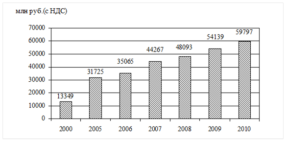 Рис. 2.6 Объем отгруженной продукции в 2000-2007 годах и прогноз до 2010 года [4] По сравнению с 2006 годом возросло производство цельномолочной продукции на 3 %, мяса, включая субпродукты первой категории, — на 4 %, макаронных изделий — на 6,3 %, хлебобулочных изделий — на 2,7 % и пива — на 51,8 %, алкогольной продукции — на 1 %. Рост объемов производства в отрасли достигнут благодаря развитию производительных сил, прежде всего вложением инвестиций в современные технологии и оборудование, позволяющие увеличить выработку на одного рабочего и в то же время повысить конкурентоспособность продукции. По итогам 2007 года инвестиции в основной капитал промышленных предприятий оцениваются на уровне 3 млрд руб. Внедрение инвестиций в модернизацию и обновление основных фондов пищевой промышленности позволило повысить эффективность их использования. Так, если в 2004 году износ основных фондов предприятий пищевой промышленности составлял 28,3 %, то по итогам 2007 года эта величина составила 27 %. Среднемесячная выработка на 1 работника в 2007 году по предприятиям пищевой промышленности составила 87,6 тыс. руб. Выше среднего данный показатель на ОАО «ПО «Красный Восток — Соло-довпиво» — 609,4 тыс. руб., ОАО «Казанский жировой комбинат» — 152,7 тыс. руб., ОАО «Заинский сахар» — 151,3 тыс. руб., ОАО «Вамин — Татарстан» — 106,8 тыс. руб., ОАО «Буинский сахарный завод» — 94,6 тыс. руб., ОАО «Татспиртпром» — 96,3 тыс. руб. Основной стратегией развития производства пищевых продуктов Республики Татарстан является разработка программ по продвижению продукции в регионы России и страны дальнего зарубежья. Решение этой задачи прежде всего требует значительных финансовых затрат как на создание конкурентоспособного продукта, так и на его продвижение, что могут себе позволить только крупные холдинги или финансовые структуры, предприятия по производству молочной продукции и продукции птицеводства. В республике развиты переработка мяса (объем производства мяса и мясопродуктов составляет около 51,8 тыс. тонн в год, объем производства колбасных изделий — 20 тыс.тонн), переработка молока (годовой объем производства цельномолочной продукции составляет в настоящее время 228,4 тыс. тонн, сыров жирных — около 35 тыс. тонн, масла животного — 22 тыс. тонн, производство сахара (170 тыс. тонн в год), производство ликероводочных изделий (в настоящее время в республике производится 4400 тыс. дал. пищевого спирта в год и более 5000 тыс. дал. алкогольной продукции), производство хлебобулочных и кондитерских изделий (объем производства хлебобулочных изделий в настоящее время составляет 219,2 тыс. тонн, объем производства кондитерских изделий — 33 тыс. тонн в год), производство пива (объем производства пива в настоящее время составляет 28000 тыс. дал.). Объем производства хлебобулочных изделий в настоящее время почти в 2 раза ниже уровня 1990 года, что связано с изменением за последние десятилетия структуры рационов потребления населением продуктов питания в сторону увеличения доли овощей, фруктов, мясных изделий. В последние несколько лет объем производства хлебобулочных изделий стабилизировался и даже несколько вырос. Дополнительной возможностью увеличения объемов производства для предприятий Республики Татарстан является выпуск продукции под брендами сетевых операторов розничной торговли. В данном направлении работа