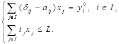 Равенство функционалов прямой и двойственной задачи Оптимизационная модель межотраслевого баланса продукции и производственных мощностей. При анализе возможностей использования модели межотраслевого баланса в планировании отмечалось, что при краткосрочном планировании наиболее существенными ограничениями роста производства являются наличные производственные мощности. Решение модели должно удовлетворять условиям xj
