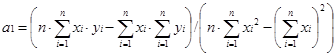 Для визначення сум стовпців використовують вбудовану функцію СУММ(блок) за допомогою кнопки Автосумування на панелі інструментів (∑) або кнопки Майстра функцій на панелі інструментів (ѓx). Введена формула копіюється в необхідні комірки 18-го рядка. Середні значення X та Y обчислюються в комірках B19, C19 з використанням вбудованої статистичної функції СРЗНАЧ(блок). До комірок B21, D21 відповідно вводяться формули для визначення оцінок параметрів відповідно а1 та а0. В результаті розрахунків модель можна записати в явному вигляді: