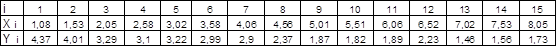 Коефіцієнт еластичності для базисних значень та прогнозу обчисляється у блоці N2: N17 за формулою Для ілюстрації одержаних результатів розрахунків будуються графіки фактичних значень показника, лінії регресії та її довірчої зони (додаток 2-3). В Excel графіки будуються за допомогою Майстра Діаграм. Спочатку відмічаються в таблиці блоки: B2: B16, F2: F16, K2: K16, L2: L16, в яких містяться необхідні для побудови графіків дані. Потім послідовно в кожному діалоговому вікні Майстра Діаграм задаються параметри діаграми (тип діаграми-графік, вид графіка, назви координатних осей та інші). Готова діаграма розташовується на робочому аркуші з таблицею даних або на окремому аркуші Діаграма. При необхідності редагування діаграми спочатку активізується певний об’єкт діаграми (ряд даних, осі діаграми тощо), після чого за допомогою команд Контекстного меню вносяться необхідні зміни в параметри. ВисновокОскільки Коефіцієнт кореляції Для прогнозу значення фактора При зміні фактора на одиницю показник зміниться на 2,62 Значення коефіцієнта еластичності під час зростання фактора від 1 до 15 зменшується у межах від 1,21 до 1,04. Для прогнозного значення середнє значення коефіцієнта еластичності дорівнює 1,04. Це означає, що при зміні фактора на 1% показник змінюється на 1,04% Завдання 3. Однофакторні виробничі регресіїДослідити стохастичну залежність і підібрати „найкращу” модель одно факторної виробничої регресії. На основі статистичних даних дослідити стохастичну залежність між фактором X та показником Y: визначити статистичні характеристики ряду одно факторних виробничих функцій за допомогою прикладної розрахункової програми на ЕОМ; за коефіцієнтом кореляції та критерієм Фішера для кожної виборчої функції вибрати найбільш прийнятну модель; Побудувати графіки статистичних даних, виробничої регресії. За результатами розрахунків зробити висновки. Розв’язок задачі необхідно супроводжувати коментарями з наведенням результатів обчислення та висновків за цими результатами. До пояснювальної записки у вигляді додатків прикладаються розраховані за допомогою прикладної програми статистичні характеристики виробничих функцій та графік, які виконані на ПЕОМ. Виконання завдання 3. При виконанні цього завдання необхідно здійснити розрахунки відповідно до етапів методу „перебору” економетричних моделей виробничих регресій. Вихідні статистичні дані варіанту № 43.
