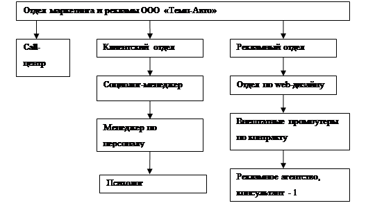 Рисунок 2.8 - Проект организационной структуры отдела маркетинга и рекламы автоцентра "Темп Авто К" На рисунке 2.8 приводится схема отдела маркетинга и рекламы, которая была разработана в рамках внедрения маркетинга на основе пожеланий руководства и с учетом первой стадии освоения маркетинга, когда он носит преимущественно сбытовой характер. Как видно из рисунка 2.8, схема маркетинга включает отдел маркетинга, которому подчиняются отдел по рекламе, по web-дизайну Интернет сайта "ТА", психолог по работе с персоналом и клиентурой, специалист клиентского отдела, начальник информационного отдела, Call-центр, менеджер по персоналу, внештатные промоутеры по проведению рекламных акций. Данная структура является промежуточной и имеет целью формирование маркетинговой ориентации в деятельности служб имеющих прямую или косвенную направленность на клиента. Тот факт, что отдел маркетинга не подчиняется напрямую отделу сбыта, позволяет маркетологам самостоятельно разрабатывать маркетинговые стратегии, рекламные кампании, вести информационно-аналитическую работу для формирования стратегических целей. Расходы на рекламу важнейшая статья маркетинга, наиболее весомая по инвестициям, так как стоимость рекламных услуг очень велика. Инфляция требует их постоянного повышения. Принципы рекламной политики: Привязка к объемам сбыта. Привязка к целям. Деление на имиджевую и товарную. Наличие 15-20% резерва от фонда. Распределение 80% фонда рекламы, в зависимости от объемов продаж. Планирование на квартал, месяц, год, полугодие. Корректирование фонда рекламы от достигнутых результатов и поставленных целей. Проведение как отдельных рекламных акций, так и рекламных кампаний. Стабильность основного портфеля рекламных акций. Дифференциация бюджета рекламы в зависимости от специфики автосалона. Совмещение бюджета рекламы с бюджетом стимулируемых продаж. Анализ эффективности рекламы: сопоставление рекламы Темп Авто с рекламой конкурентов. Оценка влияния текущей рекламы на покупателей (по данным опросов). Определение структуры рекламы. Органичная связь рекламы, пиаровских акций и стимулирования продаж. Подчиненность рекламы целям организации и целям маркетинга. Контролируемость управления рекламой. Важным аспектом внедрения маркетинга является организация системы интерактивной связи с клиентами. У многих предприятий подобная связь налажена слабо, что приводит к потере клиентуры. Наличие подобного инструмента дает возможность управлять процессами влияния на клиентуру, предвидеть потенциальные покупки, прогнозировать сбыт. Создаются таблицы с данными по статистике звонков клиентов, интересующихся моделями Hyundai. Данная статистика производится по требованию дистрибъютера еженедельно и позволяет планировать работу по продажам с одной стороны и видеть влияние отдельных средств массовых коммуникаций на клиентов - с другой. Все это позволяет повышать эффективность маркетинга и рекламы. Специфика рекламы заключается в том, что неоправданно высокие расходы на рекламную компанию могут привести к неутешительным результатам. Но с другой стороны, недостаточное финансирование рекламы может привести к падению объемов реализованной продукции, а в самом худшем варианте и к банкротству. 3. Исследование конкурентной среды ООО "Темп-Авто"3.1 Исследо