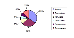 Основными лидерами в автомобильной отрасли являются "Модус", "Темп-Авто", "Юг-Авто", "Цель-Авто", "Гедон-Авто". Доля рынка, приходящаяся на различные автосалоны, представлена на рисунке 3.4