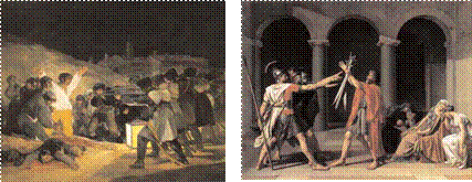Ф. Гойя. Розстріл повстанців Ж. Л. Давід. у ніч на 3 травня 1808 р. Клятва Гораціїв історії, а й усю її як єдність, поза якою долю кожної нації повною мірою осягнути неможливо. Тобто якщо безумовним здобутком «романтичного історизму» було відчуття відмінності, неповтор# ності, ексклюзивності певних явищ, відкриття історичного й міс# цевого колориту («кульор локаль»), різного для кожного народу та епохи, то наступним етапом історичної та художньої думки — реалістичного історизму — стало розуміння діалектичної подіб# ності в різному, уміння встановлювати зв’язки та схожість у тому, що постійно змінюється. У національних культурах різні народи світу формують ті чи ті комплекси естетичних проблем, які особливо гостро відчутні в кожній країні, але водночас є окремими аспектами художньої проб# лематики людства в цілому. Саме тому ступінь світового значення національного мистецтва або певного періоду його розвитку визна# чається об’єктивною цінністю його внеску до скарбниці загально# людської культури. Так, іспанський художник Ф. Гойя створив картину «Розстріл повстанців у ніч на 3 травня 1808 року» (1814), урахувавши кон# кретні умови партизанської боротьби іспанців проти французьких окупантів і традиції іспанської культури, схильної до напружено жорстких контрастів. Особливі умови назрівання Великої французької революції стимулювали звернення митців до громадянської героїки антично# го світу. Це втілилося в створенні Ж. Л. Давідом відомої картини «Клятва Гораціїв» (1784).