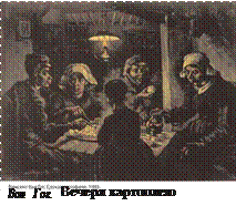 Окрім того, у творах романтиків (як і класицистів, згадаймо хоча б пана Журдена) широко представле# ні герої як носії однієї домінуючої пристрасті. Потрібно зауважити, що реалісти також використовували цей класицистичний і романтичний прийом. Так, у повісті М. Гоголя «Шинель» Акакій Акакійович Баш# мачкін якраз і є носієм однієї при# страсті — бажання пошити нову ши# нель. І що з того, що декому це може Ван Гог. здаватися дріб’язком — пошиття од# Вуглекопи нієї речі як мета, як прагнення всьо# го життя? Адже Башмачкіну — цій «маленькій людині», маленька і навіть дріб’язкова мета може видатися великою й доленосною. Натомість у реалістичних творах герой зображувався по#іншому. Дотримання принципу життєподібності вимагало від митця# реаліста глибокого психологізму в змалюванні особистості, роз# критті її багатогранності й неоднозначності. Крім того, часто герой не міг бути носієм однієї#єдиної незмінної пристрасті хоча б тому, що його характер був поданий у розвитку, постійному русі, змінах, у тому числі й у трансформації цих самих пристрастей («діалекти# ка душі» героїв Л. Толстого). Особливу увагу реалісти приділяли зображенню людини в суспільстві — література стала соціальною. Середовище «ліпить характер людини», ніби скульптор своє творіння з глини чи гіпсу. Однак тут існує і зворотний зв’язок — «створена» суспільством людина, у свою чергу, сама творить це суспільство, оскільки здатна брати свідому участь у його зміні.