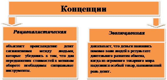 Рисунок 1.1 – Схема концепции происхождения денег Примечание. Источник: собственная разработка на основании данных [1] В основе рационалистической концепции лежит субъективистско-психологический подход к происхождению денег. Впервые эту концепцию выдвинул Аристотель. В работе «Никомахова этика» он пишет: «Все, что участвует в обмене, должно быть каким-то образом сопоставимо… Для осуществления обмена должна существовать какая-то единица (измерения), причем основанная на условности». Данная идея нашла законодательное воплощение в античном обществе. Так, одна из догм римского права гласит, что император декретирует стоимости денег. Также Аристотель утверждал: «Всеобщим средством обмена деньги сделались по соглашению. Они потому так и называются, что существуют не по природе, а по установлению, и в нашей власти заменить их и сделать бесполезными». Субъективно-психологический подход к вопросу происхождения денег характерен и для взглядов некоторых видных современных экономистов. Например, американский экономист П. Самуэльсон определяет деньги как искусственную социальную условность [2]. А Дж.К. Гэлбрейт считает, что «закрепление денежных функций за благородными металлами и другими предметами – продукт соглашения между людми». В опубликованной в 90-е гг. книге «Экономикс» К.Р. Макконелл и С.Л. Брю утверждают, что деньги заколдовывают людей. Из-за них они мучаются, для них трудятся… Деньги – это пленительная, повторяющаяся, меняющая маски загадка» Таким образом, представители рационалистической концепции рассматривают деньги как продукт соглашения между людьми, орудие технического обмена. Сегодня эта концепция подтверждается и реализуется в применении в качестве денег декретированных национальных бумажных денежных средств и совместно разработанных индустриально развитыми странами международных счетных денежных единиц в качестве международного платежного средства. Впервые эволюционную теорию выдвинул К. Маркс, заслуга которого в развитии теории денег состоит в том, что он доказал их товарное происхождение. Маркс писал, что загадочность денег исчезнет, если показать возникновение денег «от простейшей, наиболее скромной формы обмена вплоть до его ослепительной – денежной формы». [2] И действительно, развитие обмена проходит длительный путь смены следующих форм стоимости:[1] -простой, или случайной; -полной, или развернутой; -всеобщей; -денежной. Рассмотрим каждую из них более подробно. Простая, или случайная , форма стоимости соответствовала ранней ступени обмена между общинами, когда он носил случайный характер: один товар выражал свою стоимость в другом, противостоящем ему товаре. Маркс писал, что эта форма не так проста, как кажется на первый взгляд, поскольку уже здесь имеются два полюса выражения стоимости товара. На первом полюсе – товар, выражений свою стоимость, т.е. товар, играющий активную роль (он находится в относительной форме стоимости). На втором полюсе – товар, который служит материалом для выражения стоимости первого товара, он играет пассивную роль и находится в эквивалентной форме. Обмен совершался по формуле Т1 – Т2. Определенное количество одного товара обменивалось на определенное количество другого товара (например, хлеб на скот). В данном меновом отношении товары выполняют неодинаковые роли.