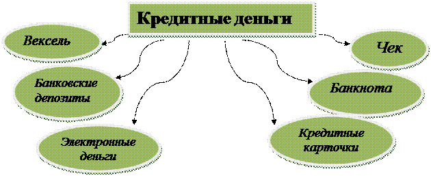 Рисунок 2.1 – Схема эволюции кредитных денег Примечание. Источник: собственная разработка на основании данных [12] Вексель – это письменное обязательство должника (простой вексель) или приказ кредитора должнику (переводный вексельтратта) об уплате обозначенной на нем суммы через определенный срок кредитору или третьему лицу. Простой и переводный вексель – это разновидности коммерческого векселя. Кроме того, имеются также финансовые векселя, т.е. долговые обязательства, возникшие из предоставления в долг определенной суммы денег. Их разновидностью являются казначейские векселя, по которым должником выступает государство. Существуют дружеские векселя, которые выставляются друг на друга с целью последующего учета их в банке. Бронзовые, или дутые, векселя – долговые обязательства, не имеющие реального обеспечения. Характерными особенностями векселя являются: [9] -абстрактность – на векселе не указан конкретный вид сделки; -бесспорность – обязательная оплата долга вплоть до принятия принудительных мер после составления нотариусом акта о протесте; -обращаемость – передача векселя как платежного средства другим лицам с передаточной надписью на его обороте, что создает возможность взаимного зачета вексельных обязательств. Использование векселя имеет свои границы: во-первых, вексель обслуживает только оптовую торговлю; во-вторых, и в оптовой торговле сальдо взаимных требований погашается наличными деньгами. Банкнота – это долговое обязательство банка. В настоящее время выпускается центральным банком путем переучета векселе, кредитования различных кредитных организаций и государства. Впервые банкноты были выпущены XVII в. на основе переучета частных коммерческих векселей. Первоначально банкнота имела двойное обеспечение: коммерческую гарантию, поскольку выпускалась на базе коммерческих векселей связанных с товарооборотом, и золотую гарантию, обеспечившую ее обмен на золото. Такие банкноты назывались классическими, имели высокую устойчивость и надежность. В отличие от векселя банкнота представляет собой бессрочное долговое обязательство и обеспечивается общественной гарантией центрального банка который в большинстве стран стал государственным. Современная банкнота потеряла по существу обе гарантии: не все векселя ,переучитываемые центральным банком, обеспечены товарами ,и отсутствует обмен банкнот на золото. В настоящее время центральные банки стран выпускают деньги строго определенного достоинства. По существу они являются национальными деньгами на всей территории государства. Отличие банкноты от векселя:[14] -по срочности – вексель представляет собой срочное долговое обязательство , а банкнота – бессрочное долговое обязательство; -по гарантии – вексель имеет индивидуальную гарантию, а банкнота – государственную гарантию. Чек – письменное распоряжение плательщика своему банку уплатить с его счета держателю чека определенную денежную сумму. В первые чеки появились в обращении в XVI Великобритании и Голландии одновременно. С развитием системы они получили широкое распространение. Различают ТРИ основных вида чеков: Именной - на определенное лицо без права передачи; Предъявительский - без указания получателя; Ордерный - на определенное лицо, но с правом индоссамента на обороте документа. Особое знач