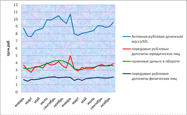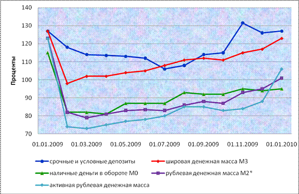 Рисунок 2.2- Динамика темпов роста агрегатов денежной массы в 2009 году Примечание. Источник: собственная разработка на основании данных [15] Рост рублевой денежной массы сложился за счет увеличения на 2,3 процента ее безналичной составляющей при сокращении на 4,9 процента наличных денег в обороте. Рублевые депозиты повысились на 3,4 процента, объем ценных бумаг, выпущенных банками (вне банковского оборота), сократился на 22,7 процента. Активная рублевая денежная масса (денежный агрегат М1) увеличилась на 5,8 процента, составив весь прирост рублевого денежного предложения за 2009 год и основную долю (54,7 процента) в объеме денежного агрегата М2* на 1 января 2010 г. Как и в предыдущие годы, внутригодовая динамика активной рублевой денежной массы соответствовала изменению объема переводных депозитов юридических лиц (рисунок 2.3).