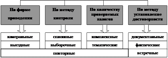 Схема 3 Виды налоговых проверок. Дадим краткое описание этих видов: · Камеральные – проводятся по месту нахождения налогового органа; · Выездные – проводятся по месту нахождения налогоплательщика; · Повторные – по тем же налогам за тот же период; · Комплексные – проводятся по всем налогам; · Тематические – проводятся по одному или нескольким налогам; · Документальные – проверяются только документы; · Фактические – кроме документов может проверяться ещё и, например, фактическое наличие объектов налогообложения, их количество и т. п. · Встречные – проверяются документы «третьей» организации, относящиеся к деятельности налогоплательщика, в отношении которого проводится основная проверка; · Сплошные – проверяются все документы налогоплательщика, относящиеся к теме проверки; · Выборочные – документы налогоплательщика проверяются выборочно. Любую проверку можно классифицировать сразу по нескольким видам (в зависимости от основания классификации). Основное деление налоговых проверок происходит по форме проведения, т. е. на камеральные и выездные. Камеральная налоговая проверка – это такая налоговая проверка, которая проводится по месту нахождения налогового органа на основе налоговых деклараций и документов, представленных налогоплательщиком, служащих основанием для исчисления и уплаты налога, а также других документов о деятельности налогоплательщика, имеющихся у налогового органа. Целью камеральной проверки является контроль за соблюдением налогоплательщиками законодательных и иных нормативных правовых актов о налогах и сборах, выявление и предотвращение налоговых правонарушений, взыскание сумм неуплаченных (не полностью уплаченных) налогов по выявленным нарушениям, привлечение виновных лиц к ответственности за совершение налоговых правонарушений, а также подготовка необходимой информации для обеспечения рационального отбора налогоплательщиков для проведения выездных налоговых проверок. Камеральная проверка имеет свои специфические задачи. К ним относятся: 1) Проверка полноты и своевременности представления налоговых расчётов в налоговый орган. Причём, в данном случае полнота раскрывается в двух аспектах: должны быть представлены все необходимые документы и все налогоплательщики должны представить налоговые расчёты и отчётность; 2) Определение необходимых доначислений сумм налога и пени; 3) Проверка правильности исчисления сумм налоговых деклараций и выявление ошибок; 4) Проверка правомерности применения налоговых ставок и вычетов, а также налоговых льгот; 5) Обеспечение накопления информации о налогоплательщике. Камеральная налоговая проверка проводится уполномоченными должностными лицами налогового органа в соответствии с их служебными обязанностями без какого-либо специального разрешения на то руководителя налогового органа. Срок проведения камеральной проверки – три месяца со дня представления налогоплательщиком налоговой декларации и (или) документов, служащих основанием для исчисления и уплаты налога. Налоговые органы обязаны обеспечивать полноту охвата камеральными проверками всей налоговой отчетности, представляемой налогоплательщиками в налоговый орган. При этом камеральной проверкой должны быть охвачены только те показатели документов, входящих в состав налоговой 