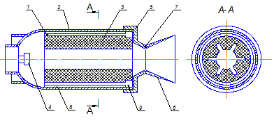 Рис.1. Схема РДТТ с вкладным зарядом ТТ: 1 – бронирующее покрытие; 2 – корпус; 3 – заряд ТТ; 4 – воспламенительное устройство; 5 – сопловое днище; 6 – раструб сопла; 7 – вкладыш (графитовый); 8 – застойная зона;9 – опорно-герметизирующий узел. Достоинства вкладного заряда: 1. возможность контроля заряда при хранении; 2. возможность замены заряда при повреждении. Недостатки: 1. вес двигателя выше, чем со скрепленным зарядом, т.к. требуется более значительный слой теплозащитного покрытия; 2. наличие дополнительных устройств, фиксирующих заряд; 3. низкий коэффициент заполнения; 4. контакт горящих газов со стенками камеры сгорания. Как правило, вкладная схема применяется для двигателей относительной небольших размеров с небольшим временем работы – для двигателей вспомогательного назначения и тактических ракет, а также для газогенераторов различного назначения. Скрепленный заряд формируется в камеру сгорания непосредственно свободным литьем или литьем под давлением, что обеспечивает его фиксированное положение и изоляцию корпуса от воздействия высокотемпературных продуктов сгорания. В этом случае заряд ТТ выполняет функцию теплозащиты. Скрепление заряда ТТ с корпусом достигается в процессе заливки топлива и последующей его полимеризации с помощью защитно-крепящего (специальное клееобразное вещество) слоя, который наносится на внутреннюю поверхность камеры сгорания перед заливкой.
