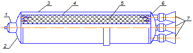 Рис.2. Схема двигателя четырехсопловой конструкции с жесткоскрепленным корпусом камеры сгорания зарядом ТТ: 1 – воспламенительное устройство; 2 – переднее днище; 3 – корпус двигателя;4 – защитно-крепящий слой; 5 – заряд ТТ; 6 – сопловое днище; 7 – сопло. Достоинства скрепленного заряда: 1. предохранение стенок камеры сгорания от прогара; 2. более простая конфигурация; 3. более эффективно использует объем камеры сгорания; 4. увеличивается прочность и жесткость РДТТ; 5. упрощенная технология заряда; 6. уменьшается возможность появления трещин. Недостатки: 1. невозможность контроля заряда при хранении; 2. невозможность замены заряда при повреждении. Скрепленные заряды применяют в основном для крупногабаритных РДТТ маршевых ступеней баллистических ракет и ускорителей мощных ракетоносителей, в том числе многократного использования. Вкладные заряды изготавливаются из баллиститного или смесевого топлива, а скрепленные – только из смесевого топлива. Это необходимо учесть при выборе топлива. Учитывая выше изложенные достоинства и недостатки, и т.к. проектируемый двигатель является маршевым и имеет большие габариты, целесообразно применить заряд скрепленного типа. 1.2 Выбор формы заряда