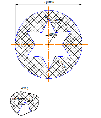 Рис.9. Звездообразный заряд со скругленными углами. 2.6 Расчет на прочность корпуса РДТТ Расчет позволяет определить толщину элементов корпуса, находящихся под давлением газов в камере сгорания. Необходимо, чтобы корпус был прочным и имел минимальную массу и стоимость. Исходные данные: Давление в камере сгорания Внутренний диаметр камеры Материал обечайки камеры 28ХСНМВФА (СП-28); Предел прочности Модуль упругости Порядок расчета: Толщина металлической обечайки корпуса