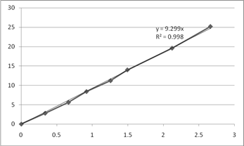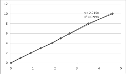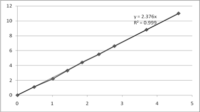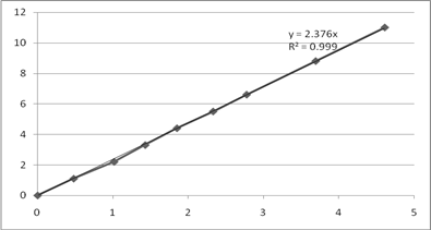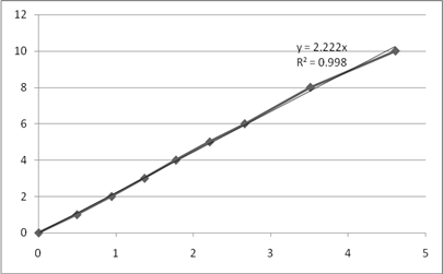 Рис. 4. Графики зависимости Порядок реакции по реагенту А1 определяем как тангенс угла наклона линии аппроксимации. 3.3 Порядок реакции по реагенту А2 Выбираем опыты, в которых начальная концентрация реагента А2 изменяется, а концентрация А1 постоянна. Эти данные приведены в таблице 7. Таблица 7. Начальные концентрации и скорости, и их логарифм для опытов №9,№8,№2,№4,№5.