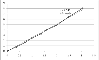Рис. 5. График зависимости Порядок реакции по реагенту А2 определяем как тангенс угла наклона линии аппроксимации. Определим порядок по реагенту А2. интегральным методом. По предыдущему расчету определили, что порядок реакции по данному компоненту первый. Тогда кинетическое уравнение будет иметь вид: