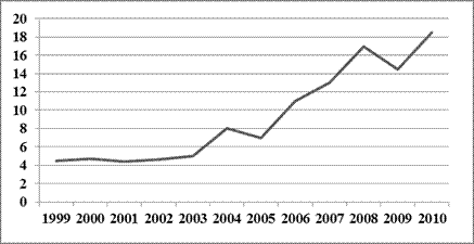 Глава 5. Динамика цен на сереброЦены на серебро росли точно такими же темпами, как и на основные инвестиционные драгоценные металлы – золото и платину (Рис. 1). За исследуемое десятилетие (с1999 по 2010г.г.) они выросли более чем в 4 раза по каждому металлу: золото – в 4,6раза, платина – в 4,3, серебро – в 4,1(Рис. 2).