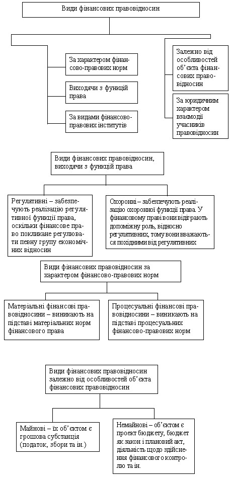 Види фінансових правовідносин Класифікація правових відносин завжди приваблює вчених, оскільки вона допомагає науковому осмисленню всього масиву відносин, що охоплюються тією чи іншою галуззю права. Перш за все, класифікація фінансових правовідносин будується на загально-правових засадах класифікації правовідносин. Проте у фінансовому праві можуть бути виділені і специфічні критерії.