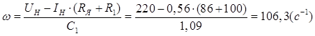 Расчетная характеристика ω = ƒ( I 1 ) Данные для расчета: U1 = UH = 220 В RДОБ = R1 = 100 Ом IB1 = 0,2 A RЯ = 86 Ом IH = 0,56 A nн =1500 об/мин