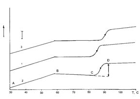 Рисунок 10. Термограммы растворов гуминовых кислот, выделенных из вермикомпостов различной степени зрелости: 1 - образец-0, 2 - зимний образец, 3 - летний образец. Tc – температура расстекловывания, ∆T- интервал перехода расстекловывания, ∆Cр - скачок теплоемкости при расстекловывании ГК. В точке В при температуре 58°С температурный инкремент теплоемкости (ðС/ðT) меняет знак с "+" на "-". В таблице 8 приведены термодинамические характеристики переходов, а также данные для процессов расстекловывания синтетических полимеров. Учитывая этот факт и то, что гуминовые кислоты в растворах образуют ассоциаты, можно предположить, что эти надмолекулярные структуры находятся в растворах в стеклообразном состоянии. В ходе сравнения термодинамических параметров расстекловывания гуминовых кислот выявлено, что значения ΔСр для образцов практически одинаковы, однако значения ΔТ и Тс различаются. Таблица 8 Термодинамические параметры расстекловывания гуминовых кислот, полученных из вермикомпостов различной степени зрелости
